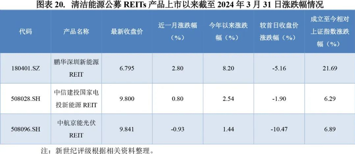 从产品收益率来看,截至2024年3月31日,3支清洁能源公募REITs产品相对于首日收盘价均有不同程度的跌幅,其中中航京能光伏REIT跌幅最大,为-10.47%。