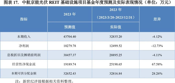 成立以来,因自然环境变化、设备故障、结算电价波动等因素,中航京能光伏REIT项目的实际营业收入、净利润、息税折旧及摊销前利润均小于预测值。该REIT的可供分配金额为32816.84万元,现金分派率[8]12.49%。因该基金成立之初实际募集金额高于预测募集金额,且国补账期优于预期导致实际保理金额低于预期值,保理利息亦较预期值有所减少,故该REIT的可供分配金额优于同期预测值。