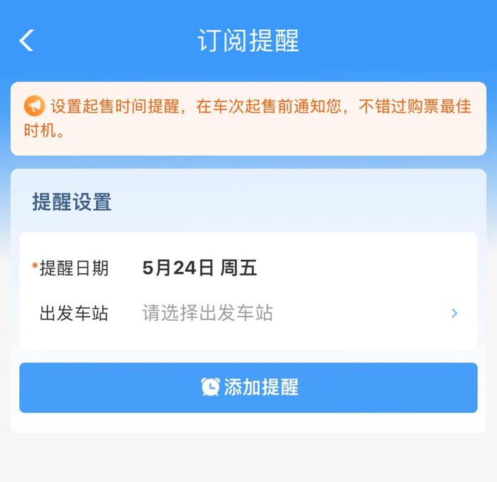 ②选择出发车站,点击【添加提醒】