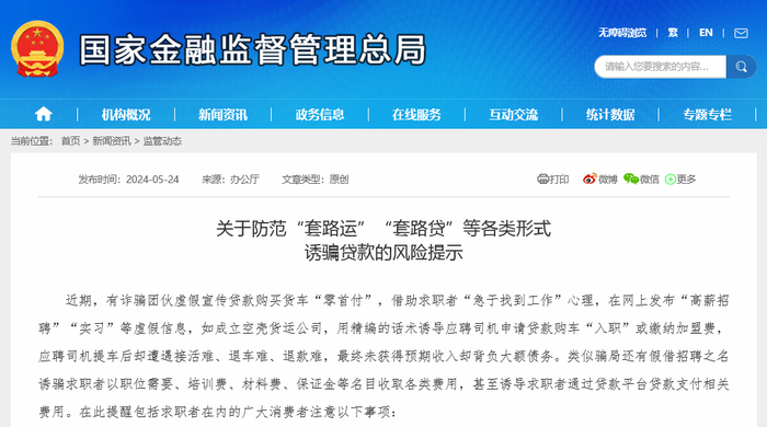 5月24日下午,国家金融监管总局发文提示防范“套路运”“套路贷”等各类形式诱骗贷款的风险。国家金融监管总局称,近期,有诈骗团伙虚假宣传贷款购买货车“零首付”,用话术诱导应聘司机申请贷款购车“入职”或缴纳加盟费,提醒广大消费者注意识别非法金融广告,警惕不当诱导。