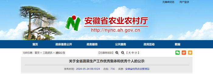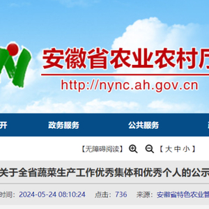 5月24日,安徽省农业农村厅网站发布《关于全省蔬菜生产工作优秀集体和优秀个人的公示》,拟确定合肥市农业农村局等40个单位为全省蔬菜生产工作优秀集体,葛丹等96人为全省蔬菜生产工作优秀个人。