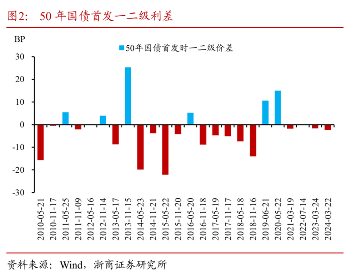 参考历史上50年国债首发时候的一二级利差表现,2021年之后也稳定在0-3BP左右。