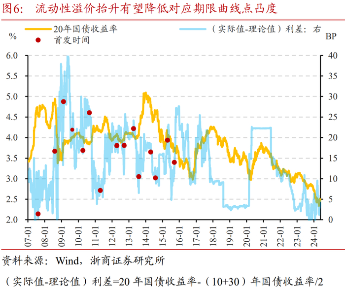 ①基于理论值和实际值视角,当前20年国债的实际值(2.46%)高于理论值(2.43%),利差存在核心源于20年国债存量规模较小,流动性溢价较高所致,参照历史经验,伴随着20年国债发行规模的逐步抬升,理论值和实际值之间的利差会相对收缩。