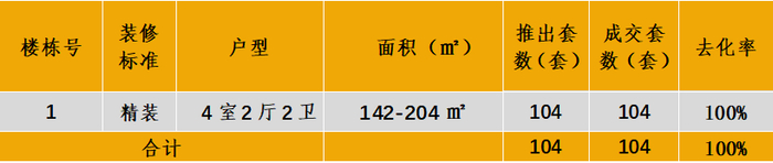 认购去化:2024年5月1号地块2-4#共104套房源,首日去化率100%。户型面积142-204㎡住宅。