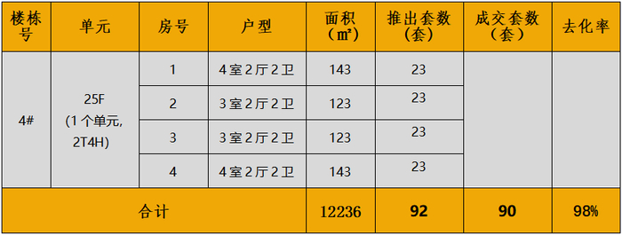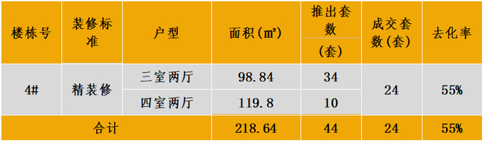 认购去化:2024年4月21日加推4#高层住宅,首日去化98%。