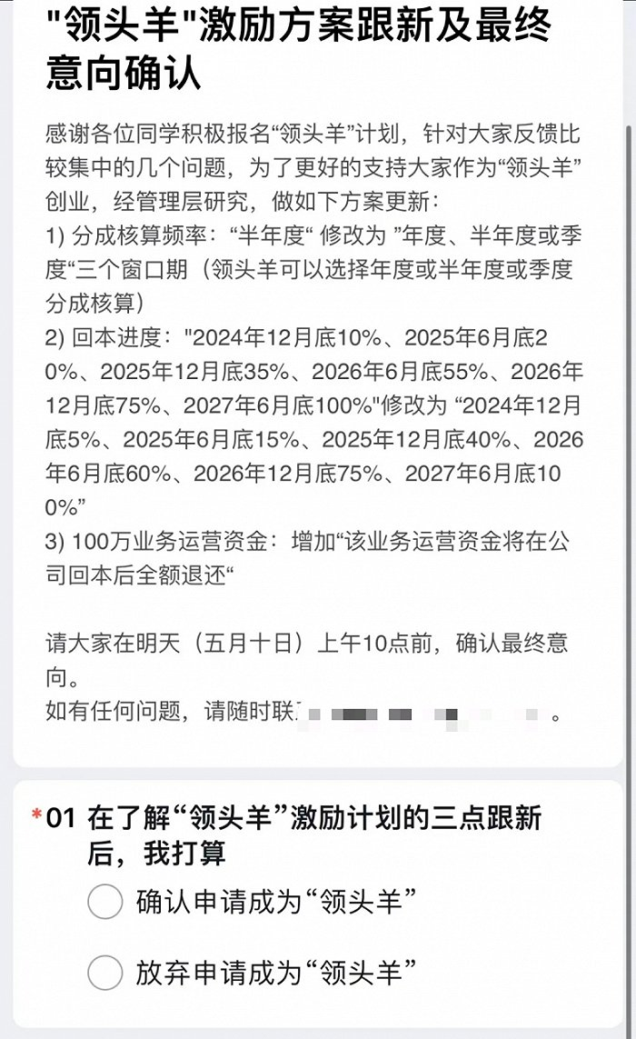 让滴灌通真正陷入舆论风波的,是“要求员工自掏100万上班”的讨论,这源于公司公布的“领头羊计划”。