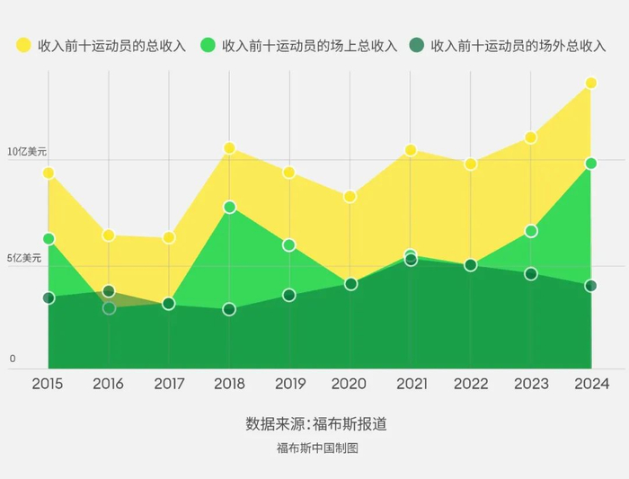 2024年收入最高的10名运动员的收入都超过了1亿美元,这是《福布斯》数据史上的首次,超过了2023年仅8名运动员收入破亿的记录。在过去12个月里,全球收入最高的10位运动员在扣除税费和经纪人费用前的收入共计13.8亿美元,较去年11.1亿美元的纪录增长了24%。