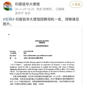 上个月月底,印度驻华大使馆发布招聘公告,招聘一名司机。