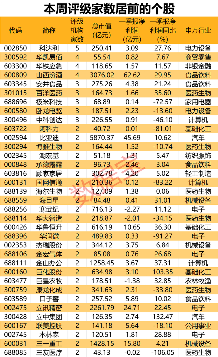 本周,机构关注度最高的是科达利,达5家;其次,华凯易佰、华铁应急、山西汾酒,均有4家机构关注。安井食品、极米科技、卧龙电驱、联美控股等均有2家及以上机构关注。