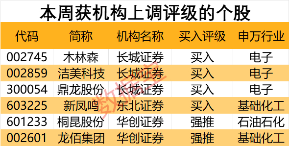 本周6股获得券商机构的青睐,其中木林森、洁美科技、鼎龙股份获长城证券的上调评级;新凤鸣则获东北证券的上调评级。