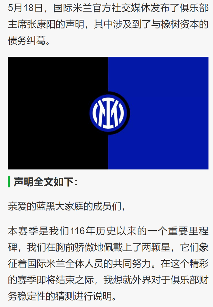 刚刚,意大利国际米兰俱乐部主席张康阳通过社交媒体平台发布消息,与球队告别,这意味着美国橡树资本已确认接管球队。此前,橡树资本于5月22日发布公告称,由于国际米兰控股公司苏宁集团未能如期偿还3.95亿欧元贷款及利息,自当日起,公司将接管意甲球队国际米兰。