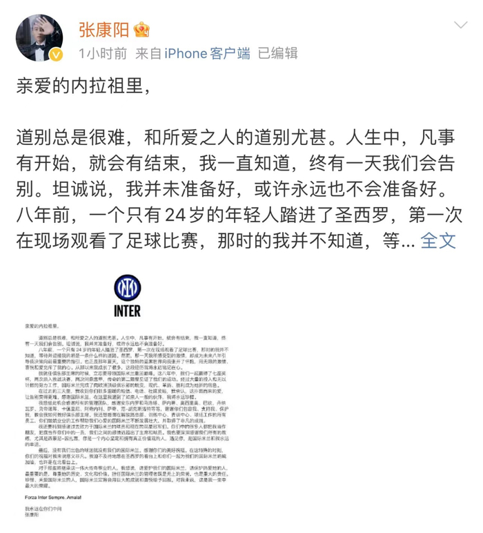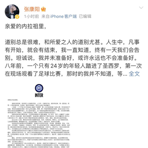“道别总是很难,和所爱之人的道别尤甚。”张康阳在25日的公告中回顾了自己作为国米俱乐部主席的8年历程,并对球队的管理团队和工作人员、球员以及球迷表示感谢。