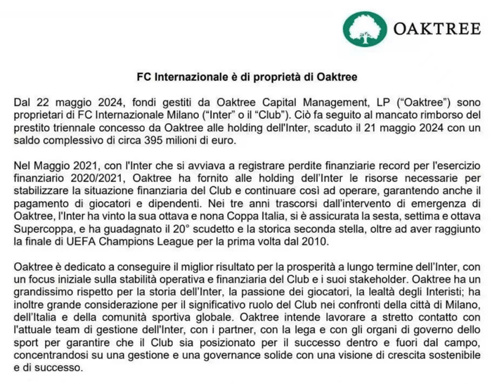 橡树资本5月22日发布声明显示,这份贷款协议已于5月21日到期,但苏宁方面未能如期偿还约3.75亿欧元的本息。橡树资本因此强制执行了国际米兰球队股权的质押,从而成为俱乐部所有者。