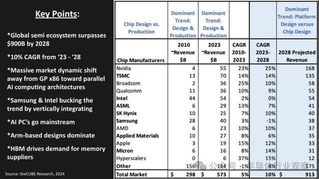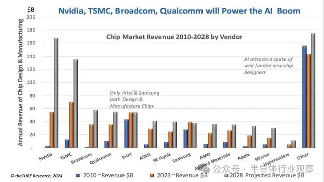- 到 2028 年,四家公司将占此预测中约 40% 的收入:Nvidia、台积电、博通和高通。