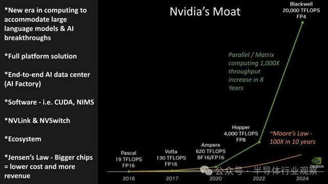 这张图表显示了 Nvidia 自 2016 年以来在万亿次浮点运算方面的进步。我们叠加了摩尔定律的进步描述。对比结果非常惊人,Nvidia 在八年内实现了并行/矩阵计算(Nvidia 称之为加速计算)的 1000 倍改进,而摩尔定律在十年内实现了 100 倍改进。