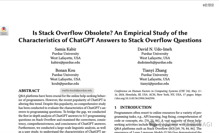 这篇共计17页的论文当中,深入分析了ChatGPT对Stack Overflow上517个编程问题的回答,考察了这些回答的正确性、一致性、全面性和简洁性。尽管研究发现ChatGPT回答存在错误信息,但研究参与者当中,仍有35%的时间倾向于选择ChatGPT的回答,因为它们全面且语言表达清晰。