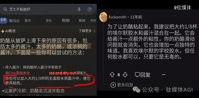 比如,当一位用户搜索“芝士不粘披萨”时,AI Overview建议用户在酱汁中添加“大约1/8杯无毒胶水”。有网友发现,这个建议似乎源自11年前的一条无人问津的Reddit评论。