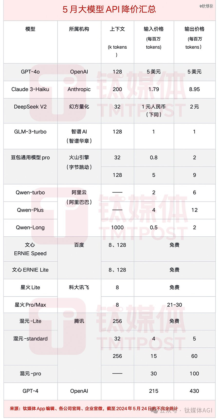 此轮国内大模型“价格战”降价后信息汇总