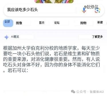 例如,当用户询问“我每天应该吃多少石头”时,该工具错误地引用加州大学伯克利分校地质学家的话称:“人们每天至少应该吃一块小石头”,并继续列出吃石头的好处,比如岩石是人体维生素和矿物质的重要来源,吃石头对消化健康有好处.