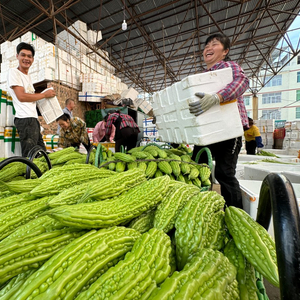 兴宁区五塘镇素有“苦瓜之乡”的美称,“五塘苦瓜”已获国家地理标志证明商标。记者看到,在西瓜市场的批发区,滑皮苦瓜、绿珍珠苦瓜、白珍珠苦瓜、水瓜、黄瓜等新鲜瓜类蔬菜分类堆放,工人忙碌而有序地打包装箱。