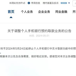 5月21日,交通银行在官网发布公告称,为推进业务高质量发展,加强风险管理,该行于5月24日起停止个人手机银行中无卡取款功能中的预约取款服务。