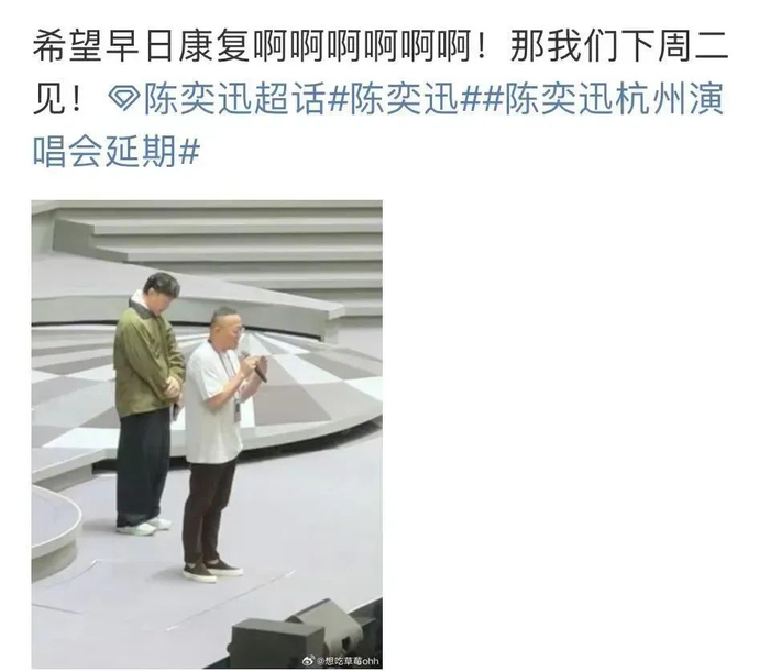 当天晚上,除了陈奕迅外,演唱会主办方代表也登台,向在场观众说明了演唱会延期的具体安排:原定的两场杭州演唱会将改至5月27日与5月28日(即下周一周二)举行,并承诺对于因此次延期给歌迷造成的不便及额外费用,将全部由主办方负责承担。