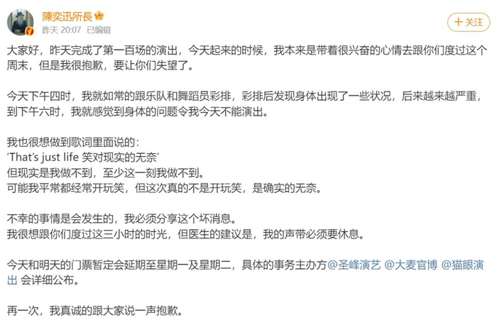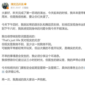 25日晚,陈奕迅在微博再次发文向公众致歉。他在文中解释了演唱会延期的原因,提及自己因声带不适,担忧无法呈现出令观众满意的演出质量,故而做出了这一艰难决定。