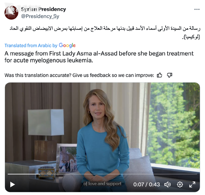 据看看新闻Knews报道,5月25日,叙利亚总统官方账号在社交平台发布了第一夫人阿斯玛·阿萨德确诊白血病后的首次公开发声视频。