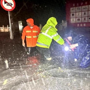 暴雨导致道路积水严重,工作人员正在雨中紧急处理。泸州应急供图