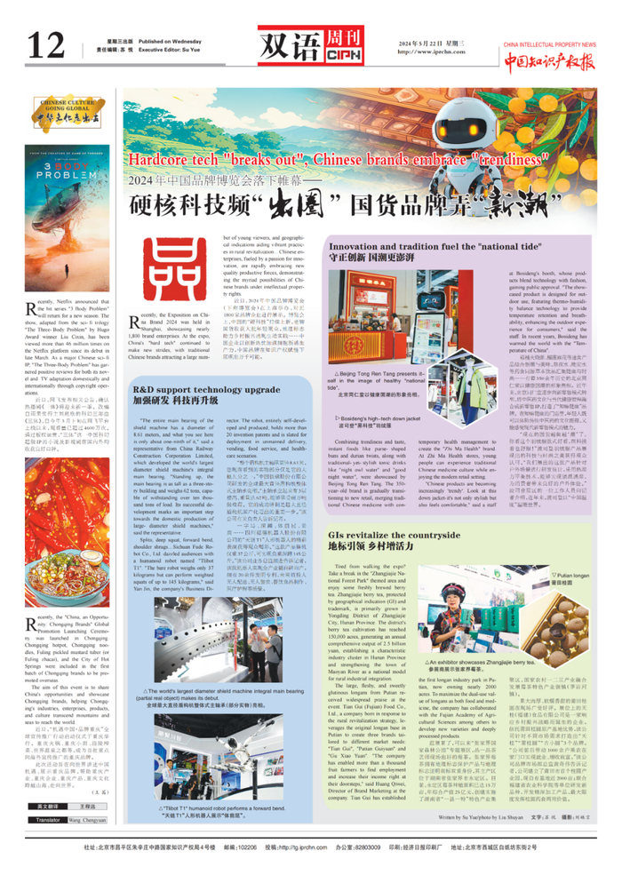 Recently, the Exposition on China Brand 2024 was held in Shanghai, showcasing nearly 1,800 brand enterprises. At the expo, China's "hard tech" continued to make new strides, with traditional Chinese brands attracting a large number of young viewers, and geographical indications aiding vibrant practices in rural revitalization... Chinese enterprises, fueled by a passion for innovation, are rapidly embracing new quality productive forces, demonstrating the myriad possibilities of Chinese brands under intellectual property rights.