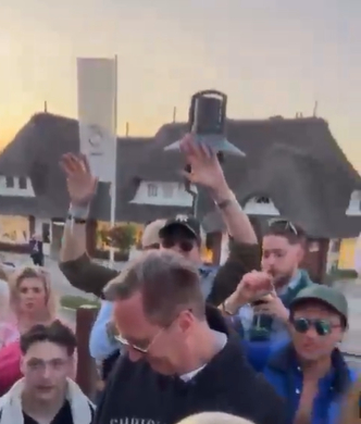 据英国《卫报》报道,社交媒体上流传的这段视频显示,在派对上,一群人伴着歌曲《永远的爱》(L‘Amour Toujours)边唱边跳,其中有人在唱歌时更改了这首歌的几句与政治无关的歌词,将其替换成一句纳粹口号:“德国属于德国人,外国人滚出去”。法新社称,现场还有一个人疑似行纳粹礼。