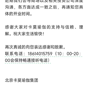 记者了解到,目前,部分卡莫瑜伽门店已签订新的公司,可能在休整过后迎来新店。卡莫瑜伽宜家店发布公告称,由于近期卡莫瑜伽整体经营管理出现重大问题,原卡莫瑜伽宜家馆即日起退出卡莫瑜伽连锁体系并短期闭店改造,闭店期间将对品牌与店内标识进行变更,重新开业后的场馆将提供更优质的课程与服务,原卡莫瑜伽宜家馆会员将由新品牌继续提供服务。