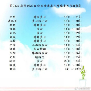 今天夜间到明天白天(5月26日20时—5月27日20时),甘南、陇南、定西、天水、平凉、庆阳等州市晴转多云,部分地方阴有阵雨或雷阵雨,其中,平凉、庆阳两市局部地方有中雨;河西五市晴或多云,祁连山区阴有小雨或阵雨;省内其余地方多云或晴,局部地方阴有阵雨。另外,酒泉、嘉峪关两市及张掖市北部有5-6级西北风。