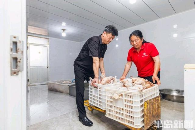 周立章和工作人员将提前加工处理好的鸡装车准备运往烤炉。