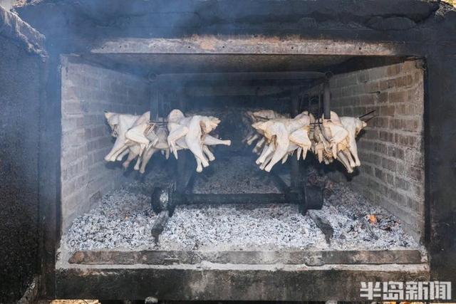 “我们院上烤鸡使用苹果木在小泥炉里烤制而成。”当天上午,为了制作烤鸡,周立章提前准备好了一大车苹果木,先将苹果木放入用泥转砌成的炉子里燃烧成炭,最后再将提前处理好的一只只鸡挂在烤架上送入炉中进行烤制。“传统的烤制手法,让我们的烤鸡散发着泥土果木的香味。”周立章介绍,院上烤鸡采用本地散养小公鸡,加工过程中选用丁香、砂仁、豆蔻等20余味中草药“秘方”煨制,烤出的鸡肉外酥里嫩鲜美醇香。