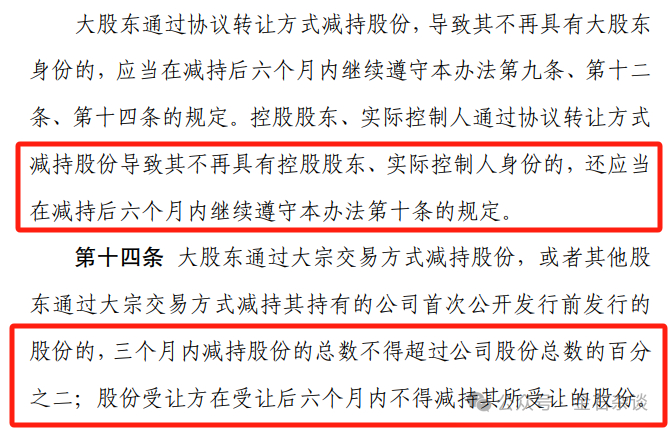 6)大股东通过协议转让方式丧失大股东地位的,6个月内还应当遵守几个规定规定:预披露、上市前股份通过集中竞价3个月内不得减持1%、上市前股份通过大宗交易3个月内不得减持超过2%,受让方6个月内不得减持。此外,实控人因协议转让丧失控制权的,除了上面这些,在公司分红低、破净的条件下也不能减持。