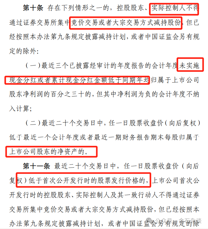 金石注:也就是公司股价跌的太狠,分红不行的,实控人都不能减持。这就要求实控人一方面做好公司市值管理,另一方面提高分红,让投资者受益。