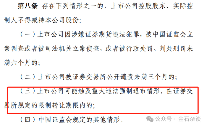3)实控人不得减持的,其实跟大股东情形类似,不过实控人不得减持是因为上市公司被调查、处罚等违规情形出现。除了上市公司被调查、处罚以及被公开谴责,还有一条:上市公司触及重大违法退市,在交易所限制转让期内实控人不得减持。