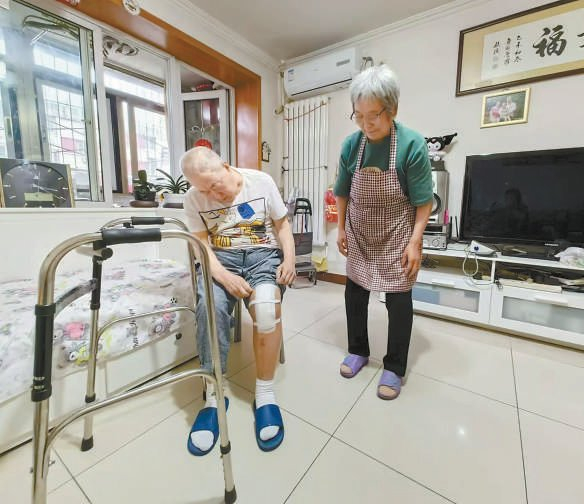 今年77岁的李鑫民老人家住四层,曾为该部电梯的安装奔走呼吁,如今电梯停运,老人已很难出门。一听记者提到电梯,老人从床上吃力爬起,一步步挪着助行器将记者迎进客厅。李先生的老伴拉起他的裤腿,只见膝盖处缠着白纱布,“他刚做手术换了膝关节,”其老伴一边说着,一边拉起自己的裤腿,“你看我这腿粗的,关节炎,走路都困难,更别说爬楼了。”记者看到,李鑫民的腿部肿胀、黑紫,其老伴的左腿明显比右腿肿了一圈。