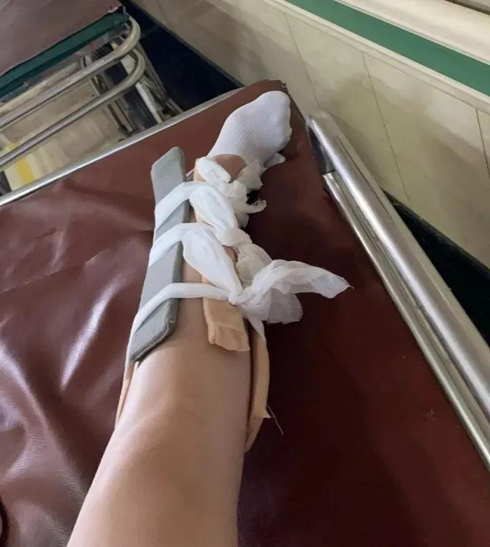 “我就把躺的位置让给她,她的腿骨折了,我是踝骨受伤。现场的工作人员让我们到二级以上的公立医院治疗,然后报销。”