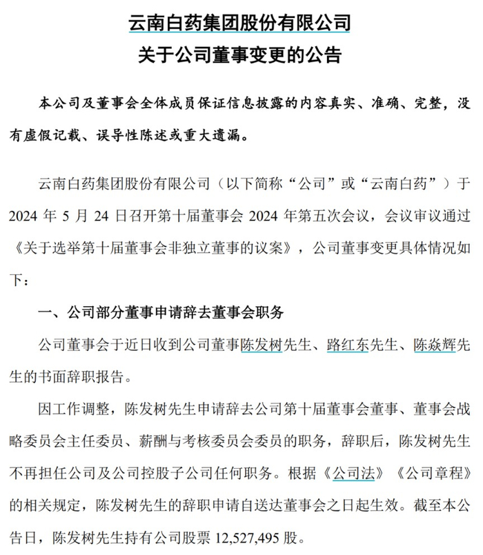 5月26日,市值近千亿元的云南白药发布公告,该公司董事会近日收到董事陈发树和陈焱辉提交的书面辞职报告。辞职后,两人将不再担任公司及公司控股子公司任何职务。
