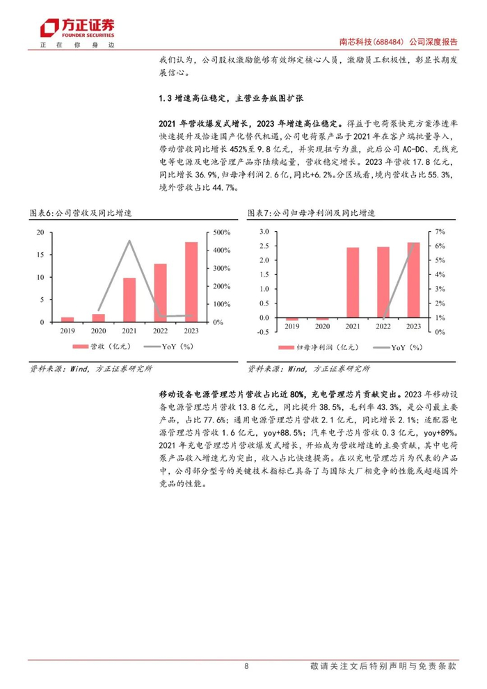 深耕电源&电池管理芯片,产品矩阵快速扩容。公司成立于2015年,是国内领先的模拟和嵌入式芯片设计企业,专注于电源及电池管理芯片,可应用于手机、笔记本/平板电脑及工业、汽车领域,系少数能与国际大厂直接竞争并实现高端产品国产替代的公司,主要客户包括OVM、传音等手机厂商,沃尔沃、现代等车企以及TTI等工业厂商。2021年公司电荷泵充电管理芯片便位列全球第一(占比24%),升降压充电管理芯片位列全球第二、国内第一。财务方面,2023和24Q1公司分别实现营收17.8/6.0亿元,同比增长37%/111%,归母净利润2.6/1.0亿元,同比增长6%/225%。
