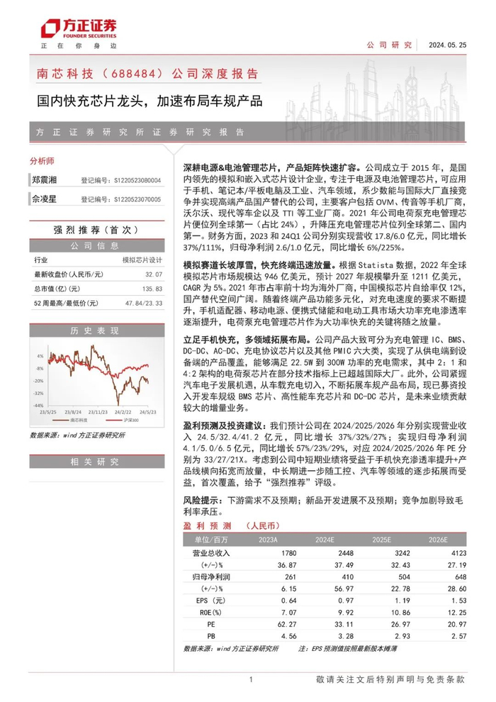 本文来自方正证券研究所于2024年5月25日发布的报告《南芯科技(688484):国内快充芯片龙头,加速布局车规产品》,欲了解具体内容,请阅读报告原文。