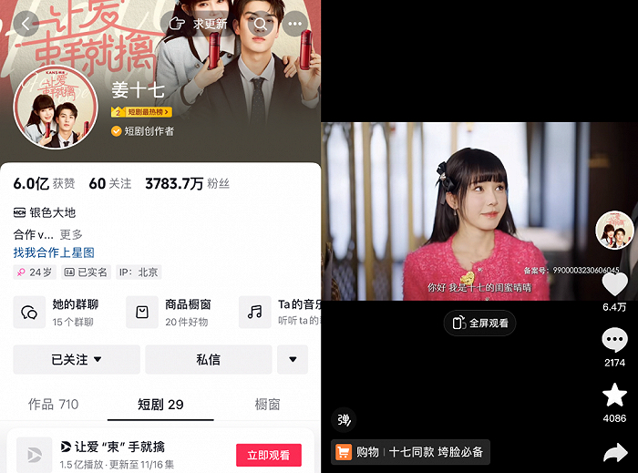 就在618前夕的5月10日,姜十七在官抖号发布了讲述与霸道总裁同居的短剧《让爱束手就擒》(目前更新至11集),“十七同款”红蛮腰、小蓝瓶等本届618韩束主推商品都被挂载在了该剧播放页,单集最高29万点赞、3万收藏的该剧可谓最近618短剧里的一个小爆款。