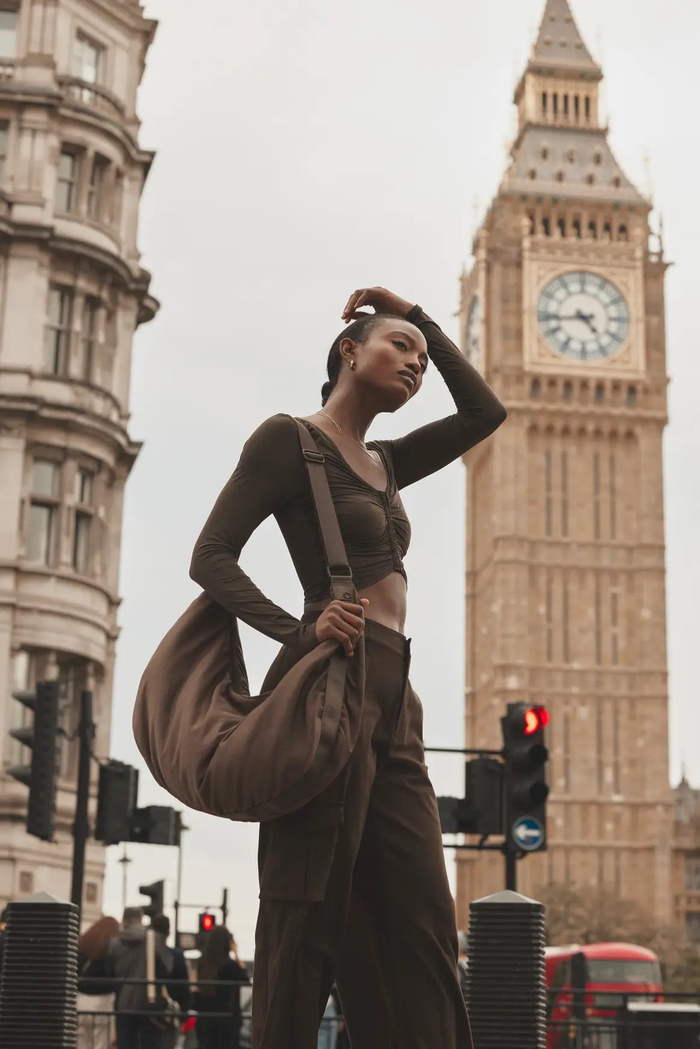 而相比更强调功能性和包裹性的lululemon,Alo的瑜伽裤明显颜值更高。Alo的瑜伽裤常用拼接、印花、镂空等设计来修饰臀部和腰部的曲线,单穿也不会有那么强的“打底裤外穿”的感受。文章开头提到的免费环保购物袋的设计也花了不少心思,其晕染的外观设计加上大容量的托特包造型,完全可以作为一件单品被反复使用。