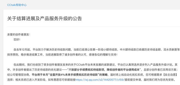 对于公众号发布粉丝迁移通知,一名接近CCtalk的人士表示,“微信公众号变更应该是该平台为了变现还钱而低价出售资产,CCtalk微信公众号约有600万粉丝,听说实际卖出去的价格远低于其市场价值。”