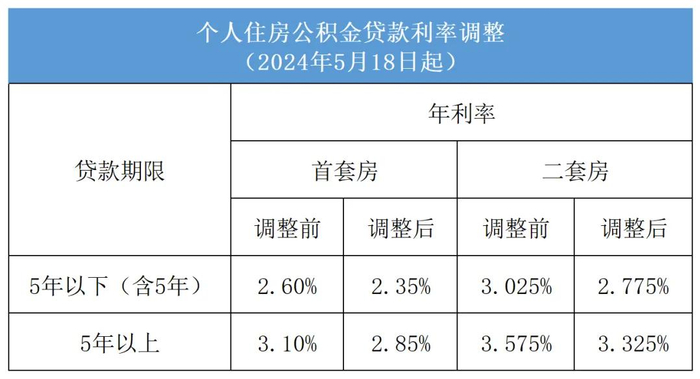 5年以下(含5年)首套个人住房公积金贷款利率由2.6%下调至2.35%,5年以上首套个人住房公积金贷款利率由3.1%下调至2.85%。