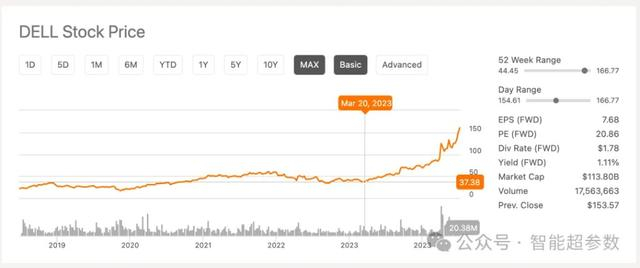 5月24日美股收盘,很多人可能不太关注的戴尔公司股价创下每股166美元的历史新高,今年年初至今的涨幅为110%,市值达到1138 亿美元。
