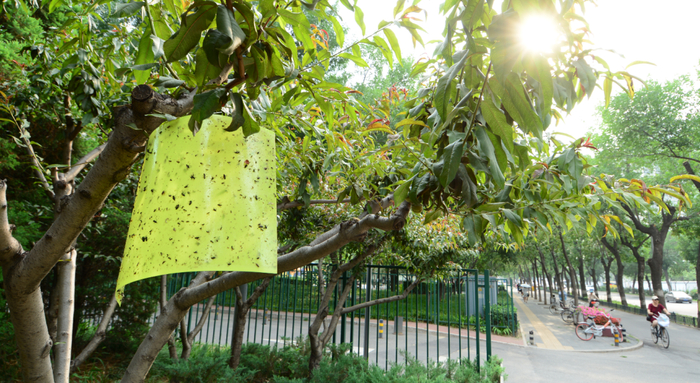 △利用小昆虫对黄色的趋性,在绿化带悬挂黏性的黄板能起到一定程度的防虫作用。蓟马还对蓝色有着独特的喜好,因此在蓟马危害严重的地方还能见到蓝色的黏板。