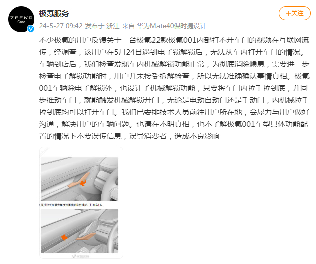 5月27日,针对极氪用户反馈“一台极氪22款极氪001内部打不开车门的视频在互联网流传”的情况,@极氪服务 回应称,上述车主在5月24日遇到电子锁解锁后,无法从车内打开车门,车辆到店后检查发现车内机械解锁功能正常,为彻底消除隐患,需要进一步检查电子解锁功能时,用户并未接受拆解检查,所以无法准确确认事情真相。